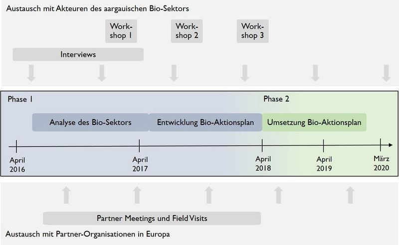 Das Projekt startete im Frühling 2016 und läuft vier Jahre. Die erste Phase dauert bis zum März 2018 und beinhaltet die Bestandsaufnahme der Biobranche und die Erarbeitung des Aktionsplans. In der zweiten Phase (bis März 2020) wird der Aktionsplan umgesetzt und evaluiert (siehe Graphik).